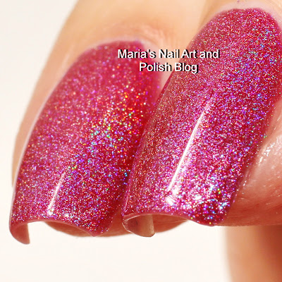 is a magenta pink jelly holo with tiny blue flakies, it’s really pretty. This is 2 easy coats with a coat of Seche Vite.